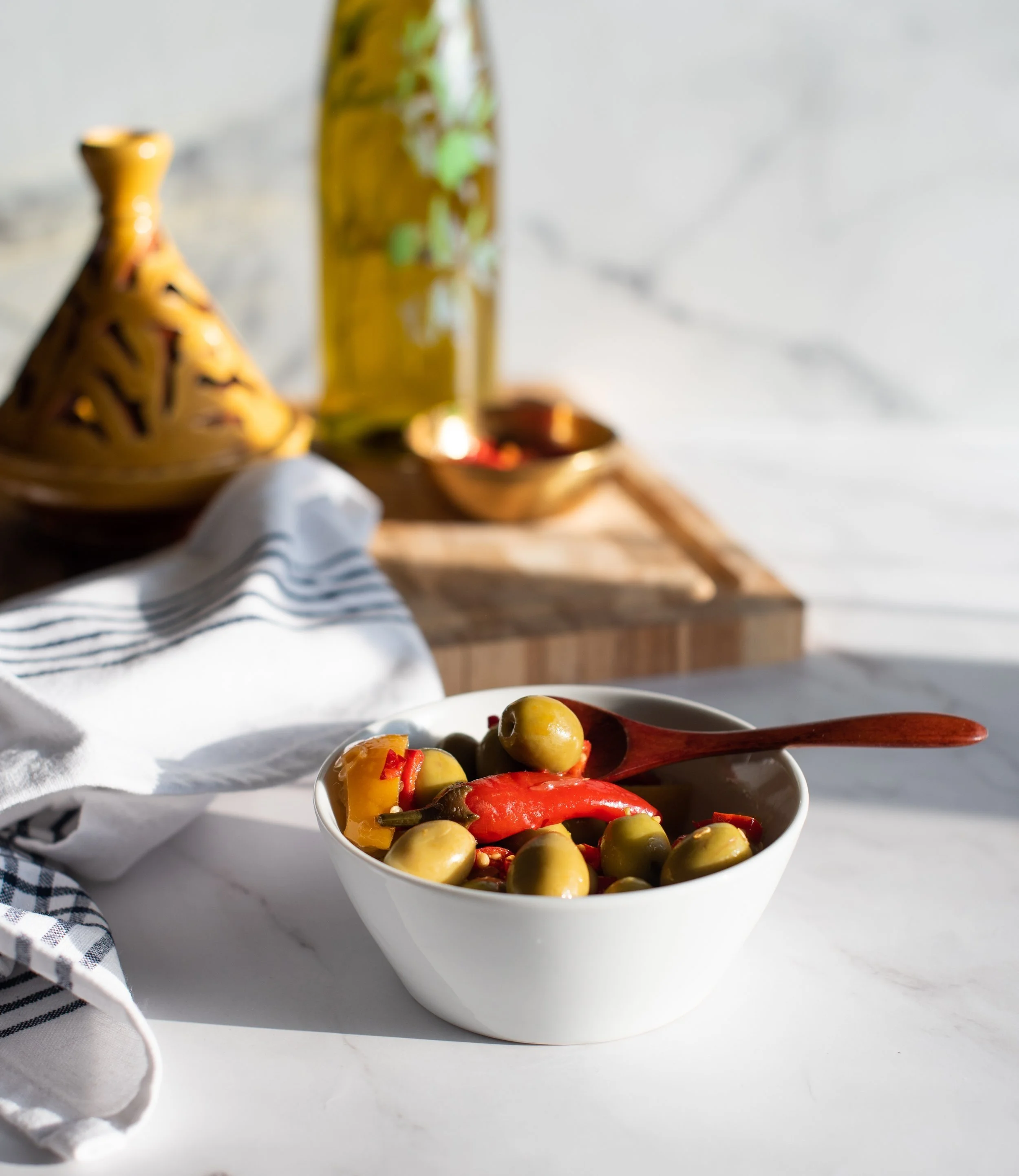 These are a must-try for anyone who loves bold and spicy flavors. Olives are a popular apéritif at Moroccan parties and used in quite a few dishes as well. I added Thai red peppers to give them a delicious and unique take on traditional marinated olives. Mom would serve a variation of these at get togethers and the bowls were usually empty by the end of the night.